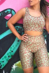 Shorts estampado de oncinha em tons de verde e marrom, é estilo bermudinha, sendo mais comprido e de cintura alta.