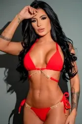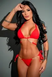 Biquíni com top cortininha e detalhe em corrente metálica, combinado à calcinha de amarração lateral que valoriza as curvas com sensualidade e elegância.