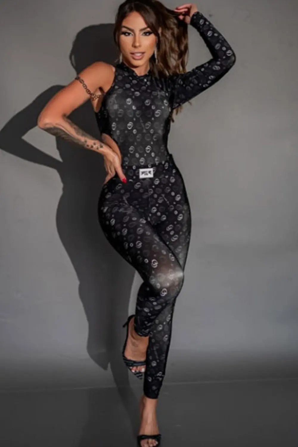 Liberte seu rebelde da moda interior com nosso body preto! Esta peça ousada foi feita para impressionar. Com seu padrão gráfico único em branco e cinza que cobre todo o traje, você se destacará da multidão com um estilo inegável. O design assimétrico adiciona um toque extra de exclusividade, apresentando uma manga longa de um lado e um visual ousado e sem mangas do outro. Para dar um toque de charme, o body traz uma abertura decorativa na lateral do abdômen, revelando a quantidade certa de pele.