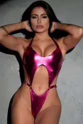 Body em acabamento metalizado, com design cavado e recortes estratégicos que valorizam a silhueta. Possui decote halter, laterais ajustáveis e modelagem que realça as curvas, oferecendo visual marcante e sofisticado para produções ousadas e modernas.
