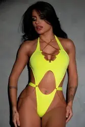 Body com design ousado e sofisticado, que valoriza a silhueta com recortes estratégicos. Possui decote diferenciado, amarração no pescoço e nas costas, além de detalhe em correntes que adiciona um toque moderno e sensual. Ideal para beachwear ou produções fashion de impacto.