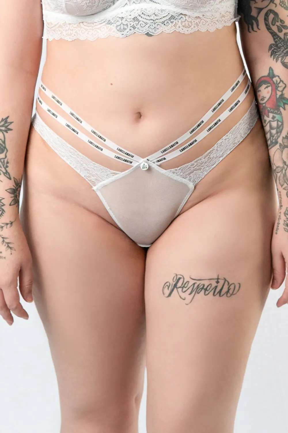 Características: Calcinha feita em renda e tule brancos, de modelagem fio-dental. Possui elásticos duplos personalizados LabellaMafia nas laterais.