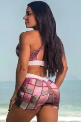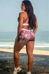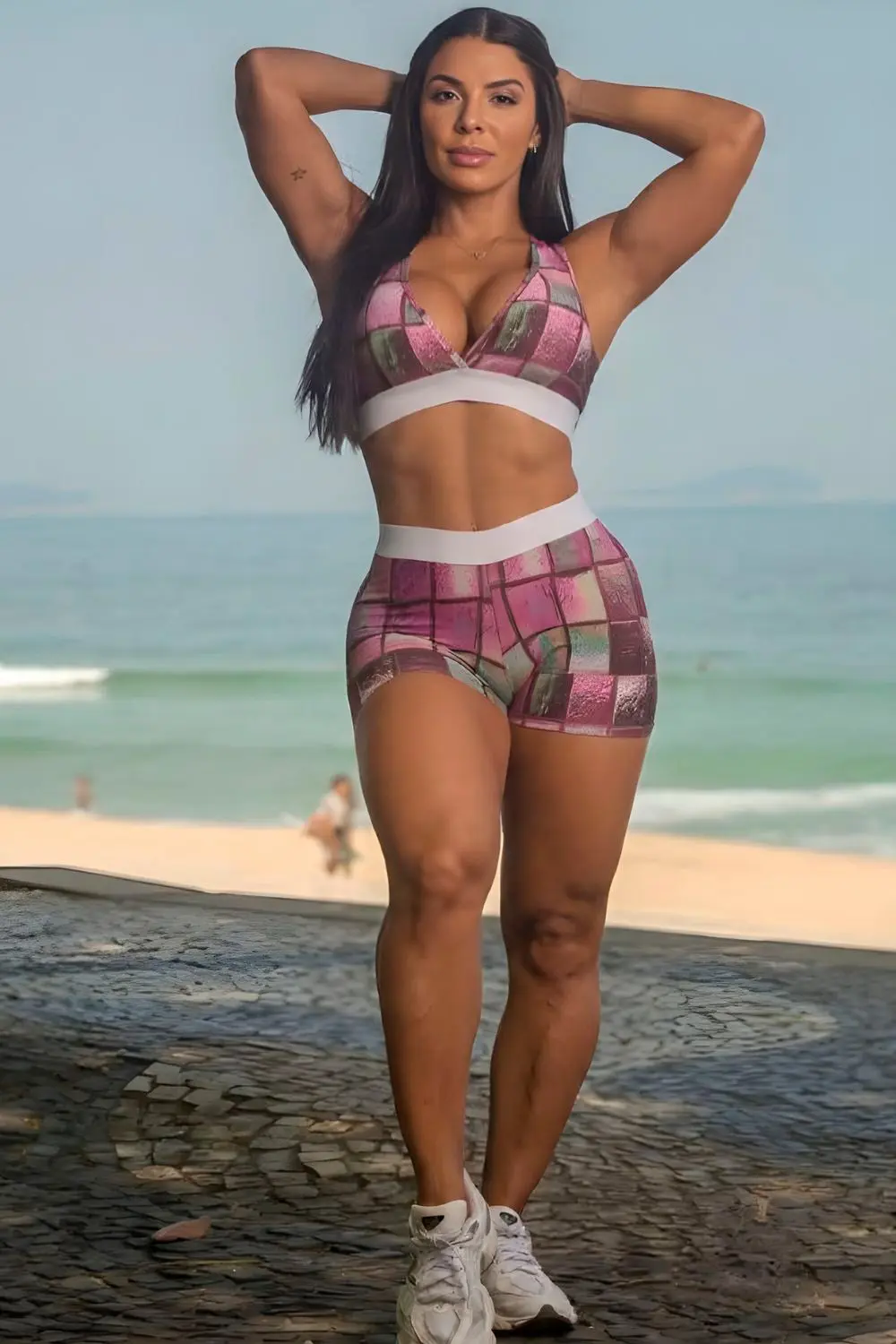 Conjunto fitness com estampa xadrez em tons rosé, composto por top e short de cintura alta. O top oferece ajuste confortável e sustentação, enquanto o short proporciona modelagem firme e caimento que valoriza a silhueta. Ideal para treinos e produções fitness com estilo marcante e moderno.