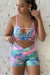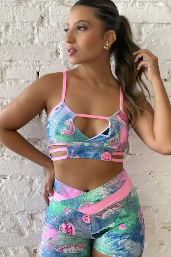 O conjunto tem um cropped com alças finas rosa neon, recorte em gota no busto e tiras abaixo dele, dando um toque moderno. O short é justo e de cintura alta. A estampa é colorida, com fundo aquarelado em azul, verde e rosa, e desenhos de arco-íris e carinhas sorridentes, criando um visual alegre e divertido.