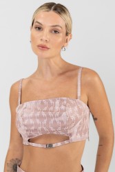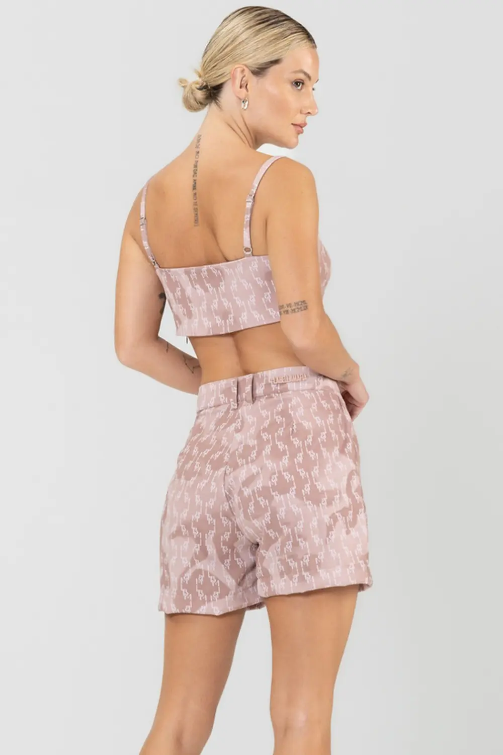 Características: Conjunto rosa claro confeccionado em estampa gráfica branca em toda a peça, é composto por um top com abertura decorativa abaixo do busto e alças finas e um short com alças decorativas no cinto e bolsos.