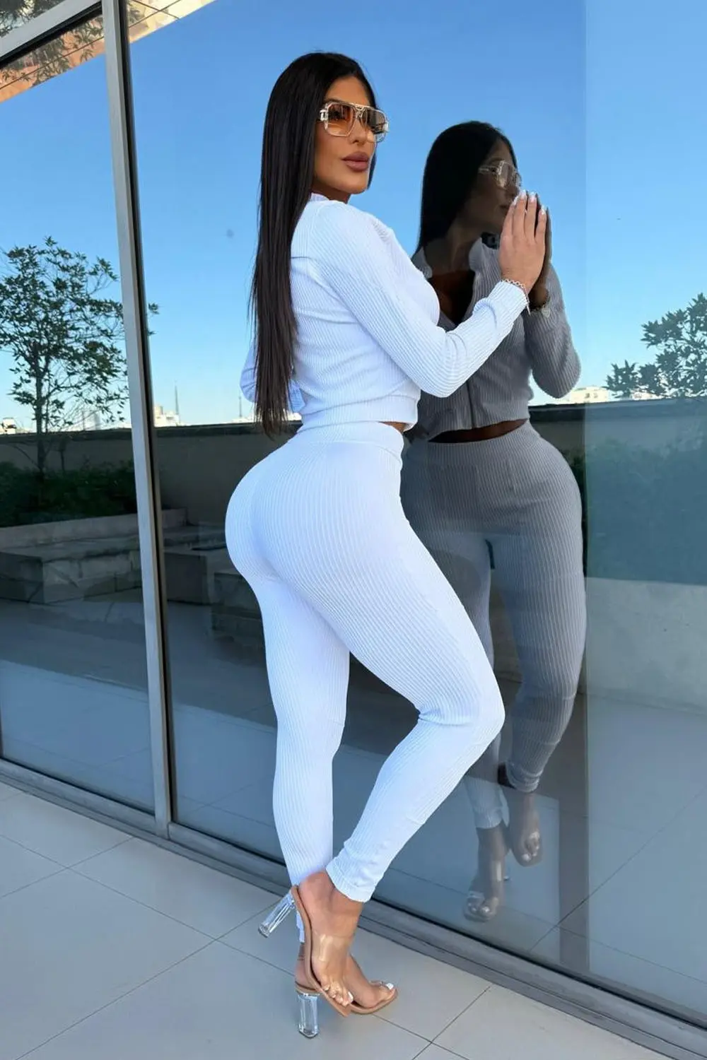 O conjunto apresenta duas peças em tecido canelado branco. A blusa, de manga longa, possui zíper frontal, decote em V e comprimento cropped. A calça é de cintura alta e caimento justo ao corpo. O design é contemporâneo e versátil, ideal para um visual casual e elegante.