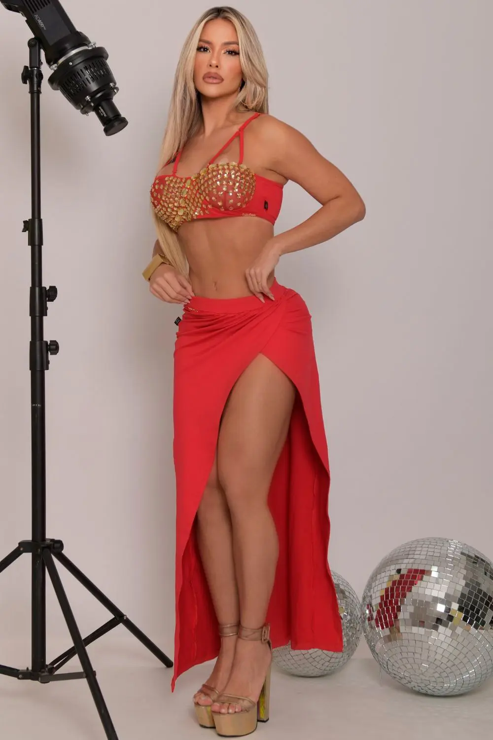 Conjunto composto por top com aplicação de pedrarias douradas e alças finas, combinado com saia longa de fenda lateral alta. A modelagem valoriza as curvas e traz um visual elegante e marcante, perfeito para ocasiões especiais ou festas.