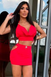 Conjunto composto por top decotado com amarração nas costas e saia justa com recortes laterais e detalhe frontal. Modelagem que valoriza as curvas e traz um visual ousado e sofisticado.