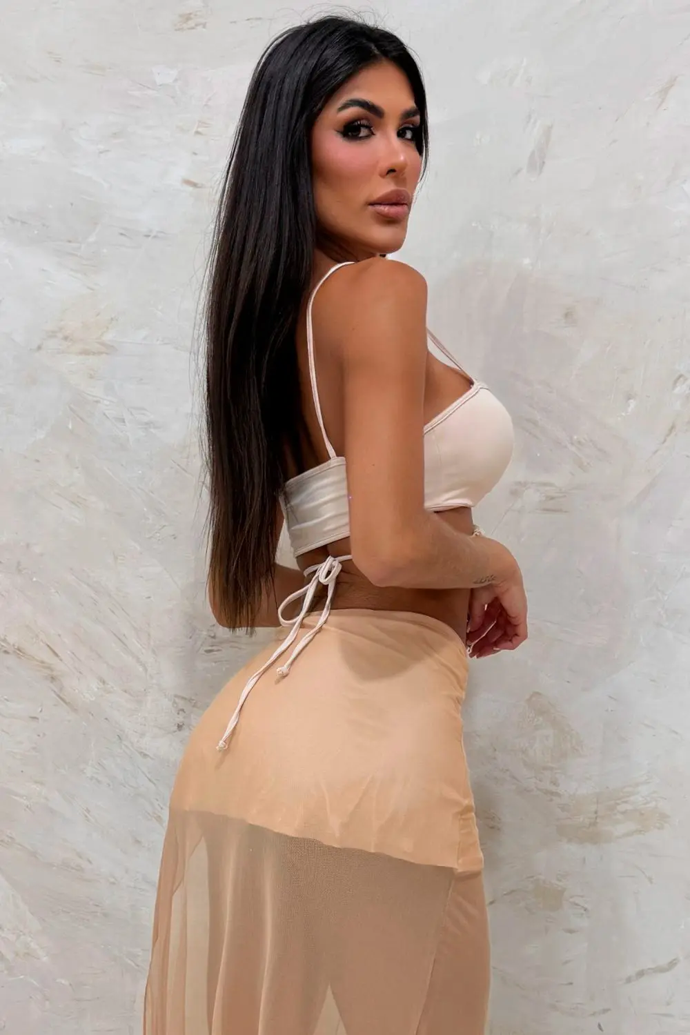 Conjunto elegante, composto por top com design ousado, recortes estratégicos e amarrações que valorizam a cintura. A saia longa com transparência suave e fenda marcada adiciona leveza e movimento. Um look sofisticado, ideal para eventos de verão e produções que pedem presença e estilo.