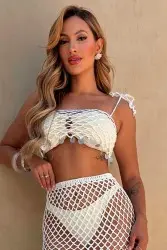 Conjunto branco que traz leveza e charme ao visual. O top com amarração valoriza o busto, enquanto a saia ajustada destaca a silhueta com elegância. Ideal para produções de verão, praia ou eventos ao ar livre.