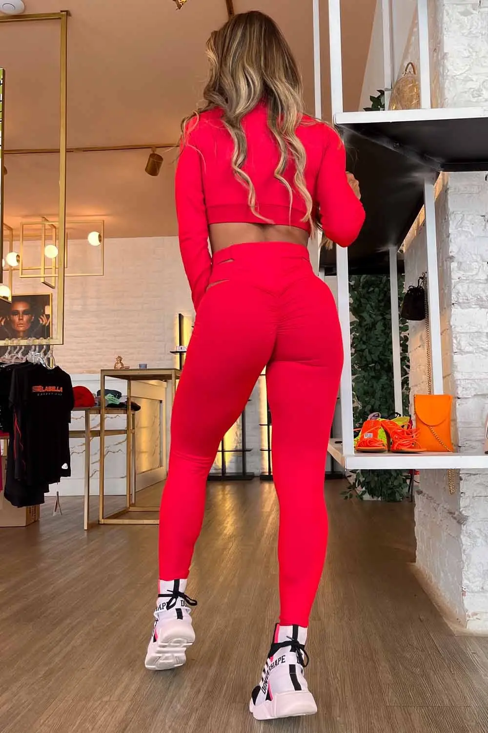 Características: Conjunto composto por top vermelho basico, manga vermelha com dedal, legging cintura alta com straps laterais e empina bumbum.