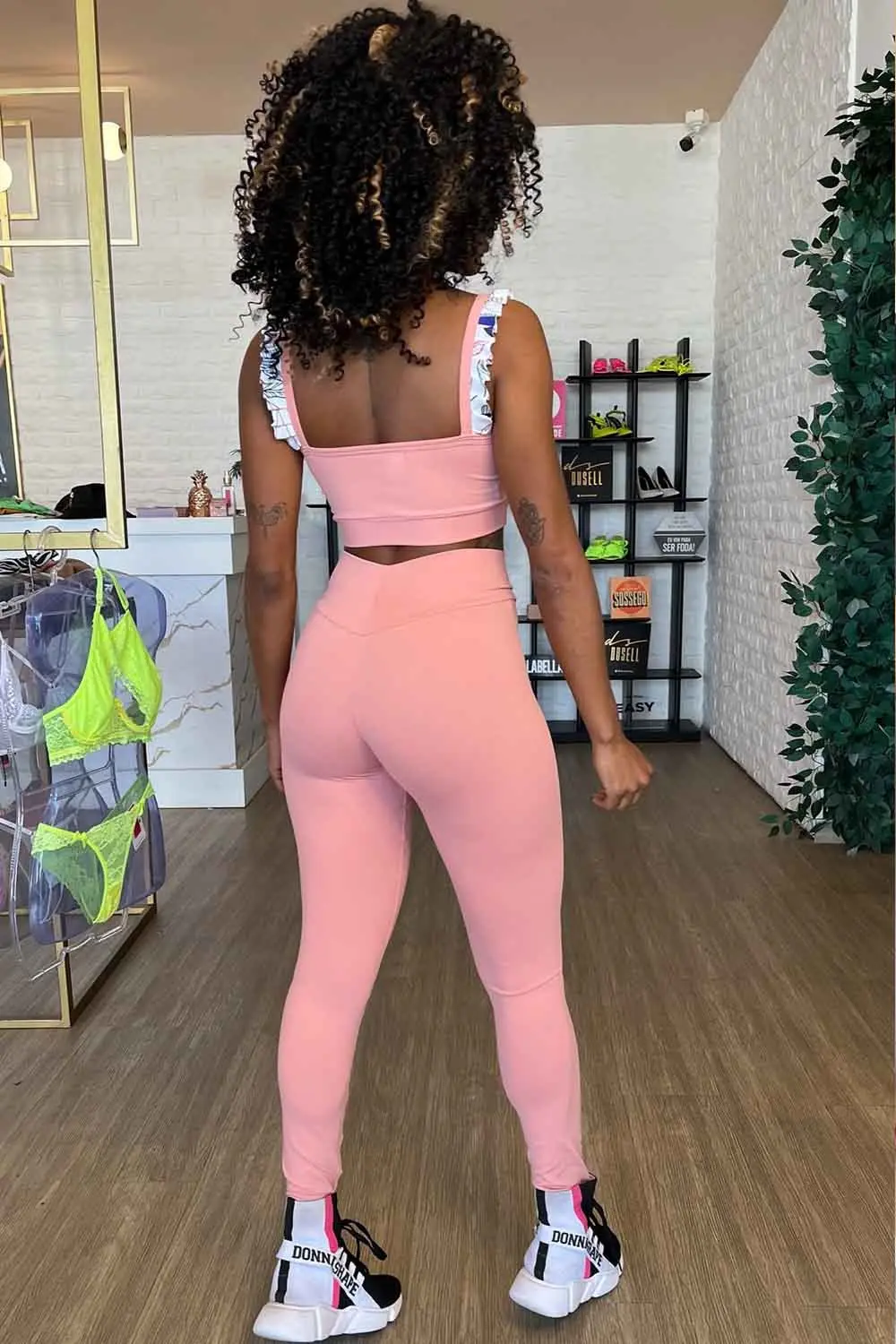 Prepare-se para abraçar o estilo sem esforço com nosso deslumbrante conjunto em cor nude! Este conjunto dinâmico apresenta um par de leggings elegantes e um top cropped com decote projetado para chamar a atenção. Com laços decorativos adornando o busto e detalhes brancos adicionais acentuando as alças, este conjunto adiciona um toque divertido ao seu guarda-roupa diário.
