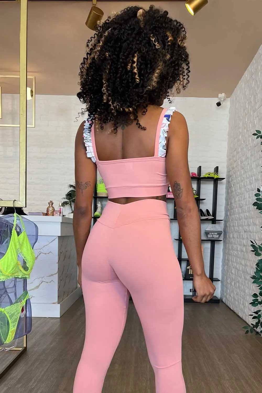 Características: Conjunto leggings e cropped decotado com laços decorativos sobre o busto, com detalhes adicionais em branco sobre as alças. com empina bumbum