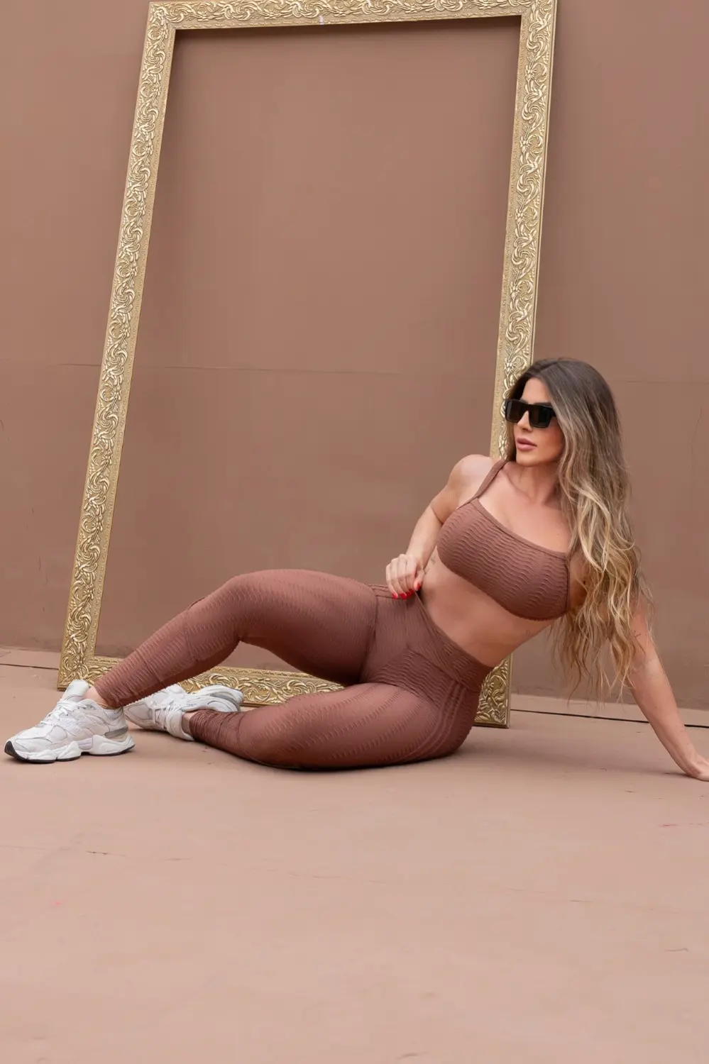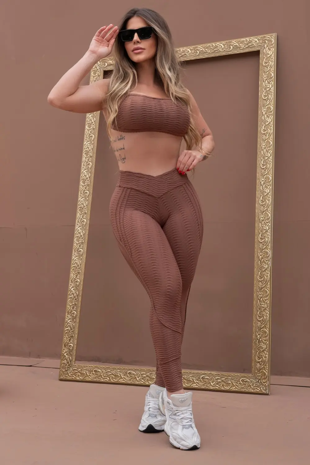 Conjuntinho fitness brocado em tom de marrom composto por top de alças finas no ombro e uma tira fina também nas costas, conferindo mais charme ao look e frescor com as costas livres. A legging é de cós alto e COM EMPINA BUMBUM, que ressalta as curvas do corpo, além de costuras desenhadas que dão mais graça ao look.