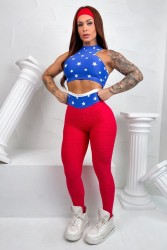 Conjunto fitness inspirado no estilo bandeira americana, com top de alta sustentação em azul estampado com estrelas e legging vermelha texturizada, que valoriza as curvas e garante conforto durante os treinos.