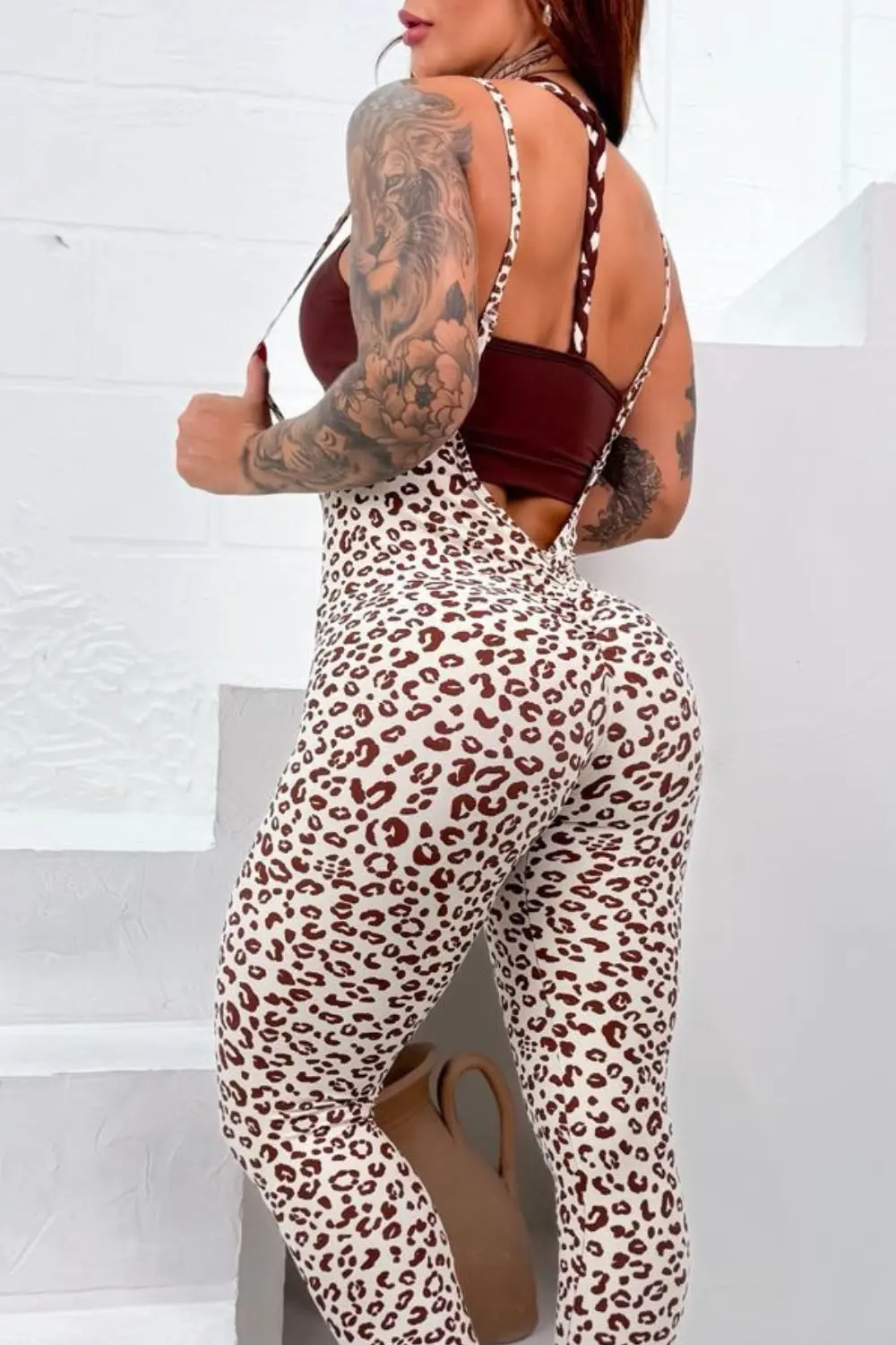 Ideal para quem busca um visual moderno e confortável, este conjunto de leggings e top oferece uma combinação única. A legging com estampa de onça se destaca, enquanto o top cropped marrom com alças e detalhe de babado completa o look. Uma peça versátil para o seu dia a dia ou para os treinos.