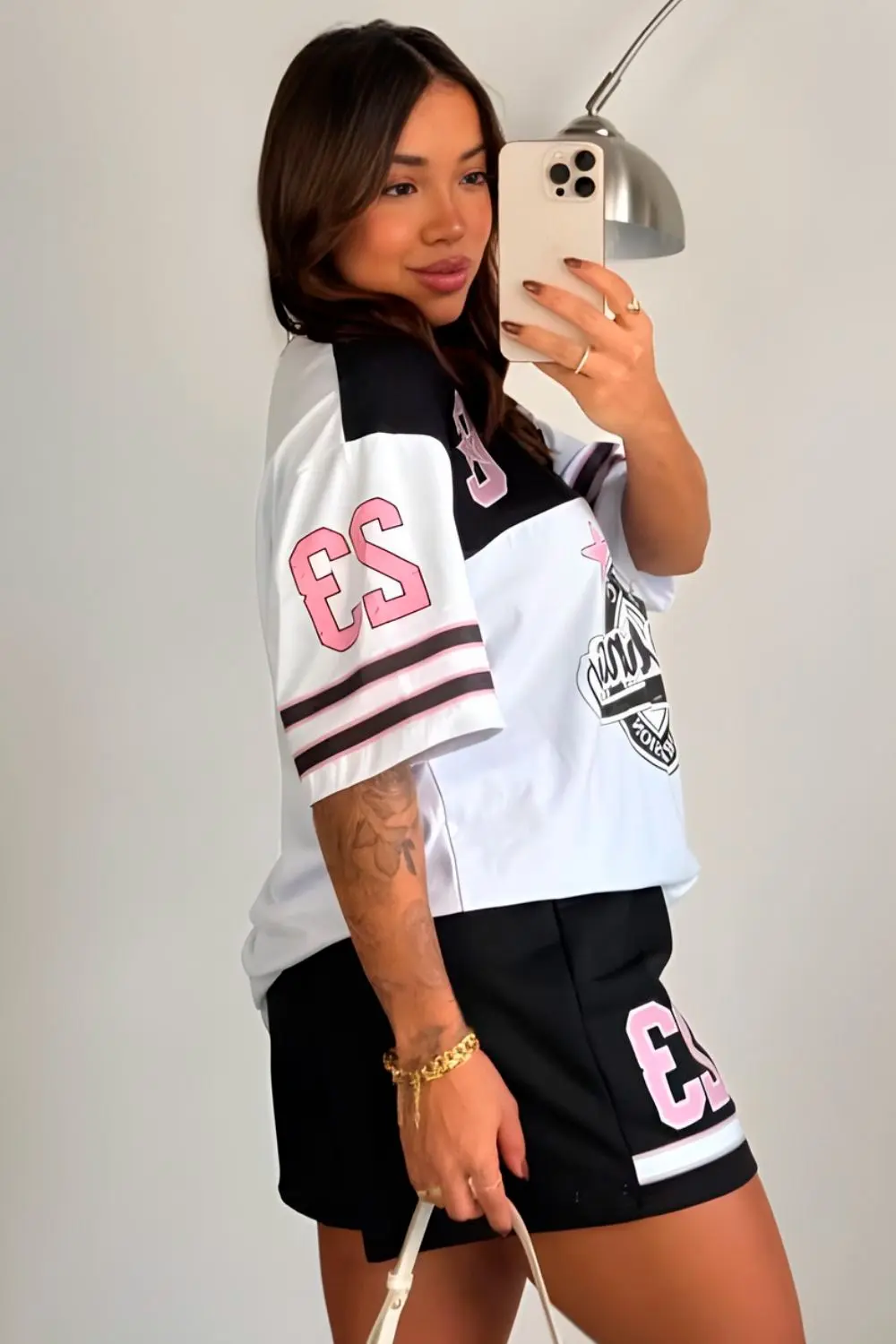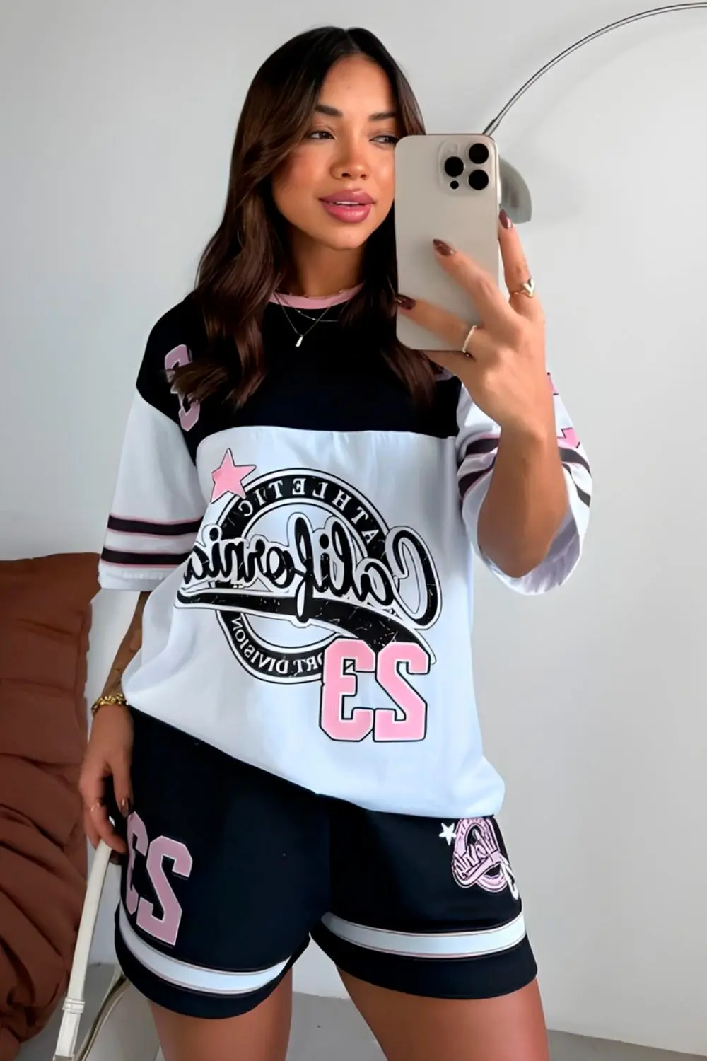 Conjunto esportivo estilo college com T-Shirts e short confortável, recortes contrastantes e estampa marcante. Visual Sporty fashion com atitude e conforto.