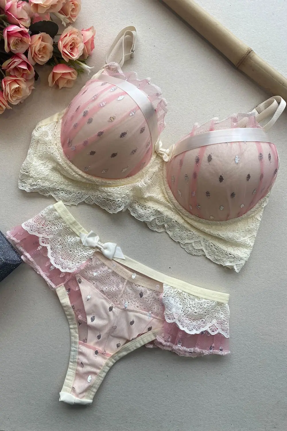 Características: Conjunto composto por sutiã com bojo e com aro, alças ajustaveis, com tule rosa com brilhos e calcinha semi-fio off-white com detalhes em tule rosa com brilho