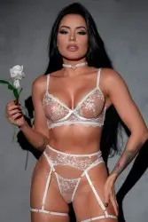 Conjunto de lingerie em tule transparente com bordado floral delicado e recortes estratégicos. Possui sutiã com aro e alças ajustáveis, calcinha fio com laterais finas e cinta-liga com tiras reguláveis que valorizam as curvas. Um modelo sensual e sofisticado, ideal para ocasiões especiais.