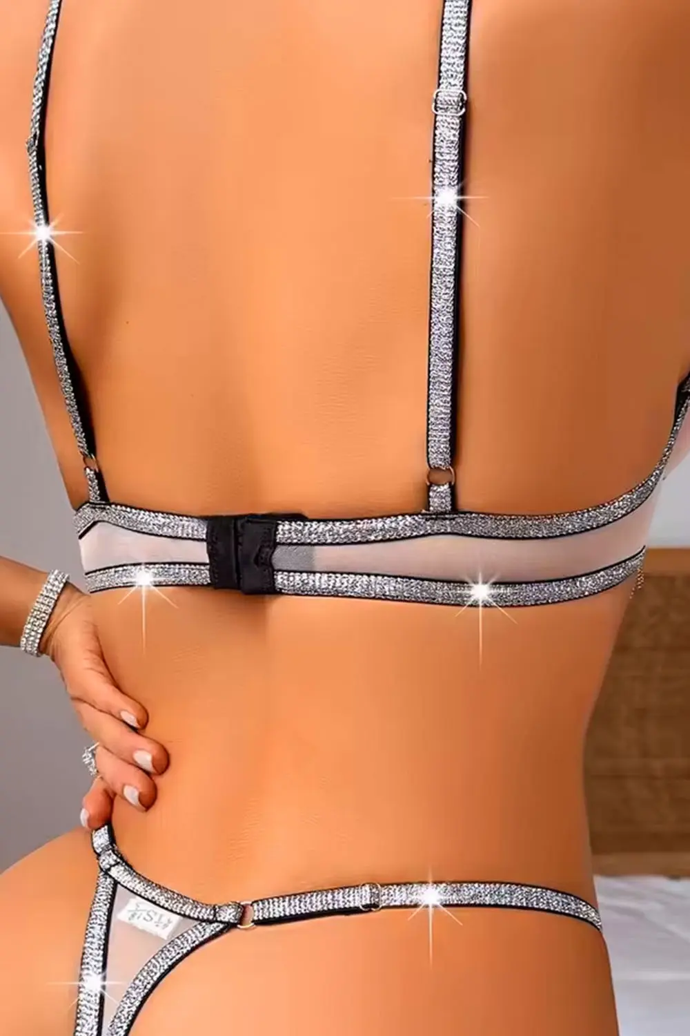 Eleve sua sensualidade ao nível máximo com o nosso Conjunto de Lingerie Estrelada de Luxo, a peça que faltava para brilhar! Desenhado para mulheres que não têm medo de ser o centro das atenções, este conjunto combina a elegância discreta do tule nude (cor da pele) com o glamour cintilante de aplicações de strass premium. O design inovador apresenta estrelas pretas marcantes no busto e na calcinha, adornadas com franjas de strass que se movem com você, adicionando um toque de mistério e movimento irresistível.