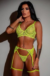Conjunto em renda neon com sutiã sem bojo, calcinha combinando e cinta-liga ajustável. Design marcante que valoriza o visual com estilo moderno e acabamento detalhado.