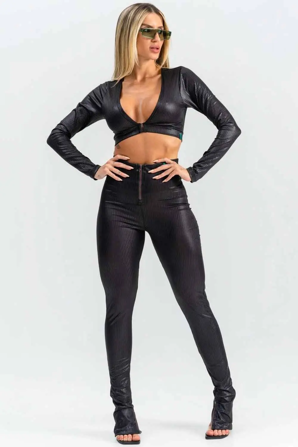 Descrição: Cropped com tecido canelado, mangas compridas, argola quadrada central e decote em V.