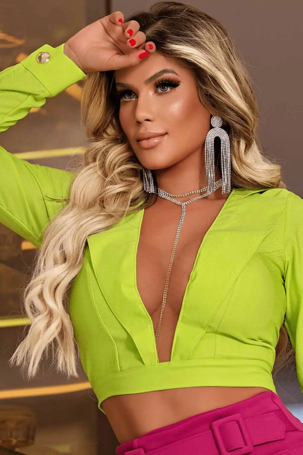 Características: Procurando um top mais diferenciado? Este cropped inspirado em blazer é a escolha perfeita! O elegante design em verde neon com decote adicional para um toque de sofisticação, enquanto o comprimento curto adiciona um toque de glamour.