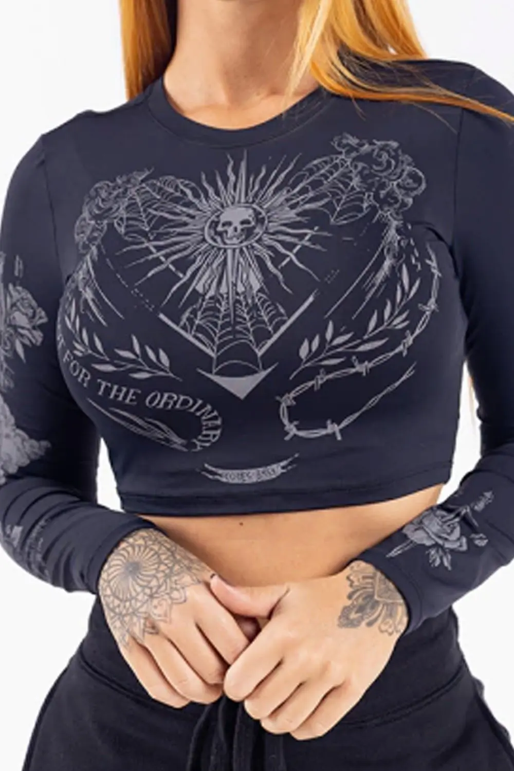 Características: Blusa cropped preta com mangas compridas e estampa gráfica cinza em toda a peça, inspirada em designs de tatuagens.