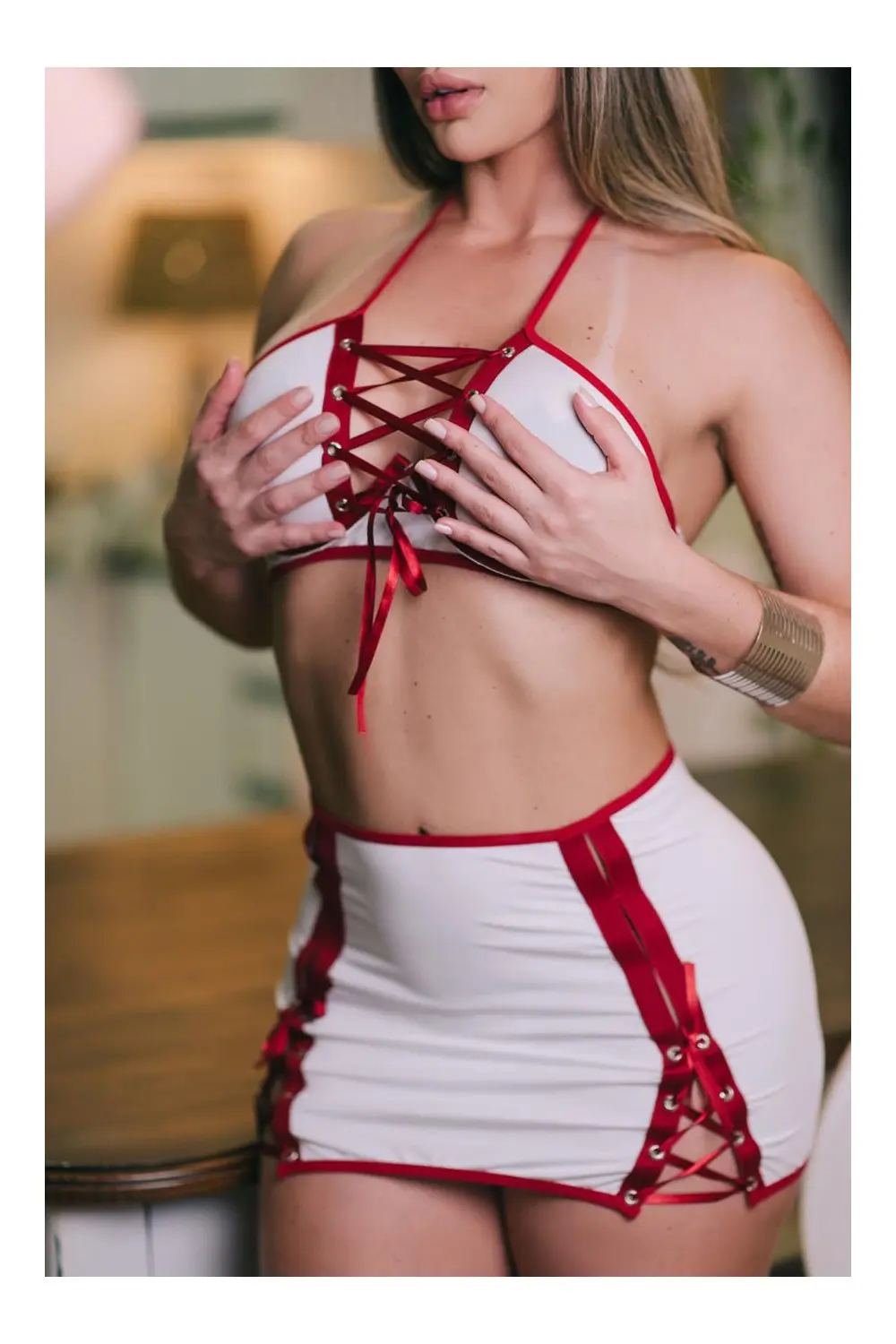 A fantasia Enfermeira Tentadora combina sensualidade e charme, com um top sem bojo que molda o busto de forma provocante, utilizando um aro de sustentação e trançado em fita. A saia com detalhes em fita acrescenta um toque ousado ao visual. Cada detalhe foi projetado para intensificar o desejo e o mistério, tornando-a ideal para momentos de sedução e fantasia.