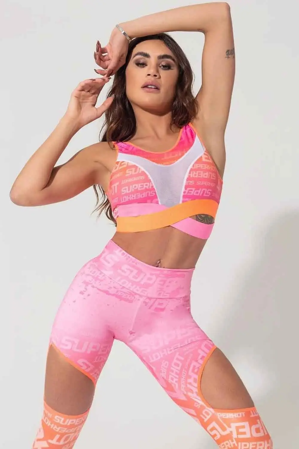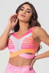 Características: Top regata, decotado nas costas e decote do busto em tule branco, gola U e cós transpassado em elásticos laranja neon e rosa. Não possui bojo.