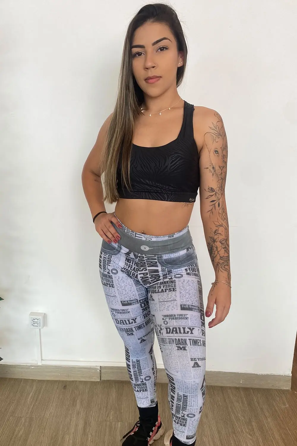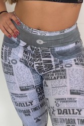 Entre no centro das atenções com nossas leggings brancas que redefinem o casual chique! Eleve o seu estilo de moda com esta maravilha de cintura alta com uma estampa gráfica cativante inspirada em jornais.
