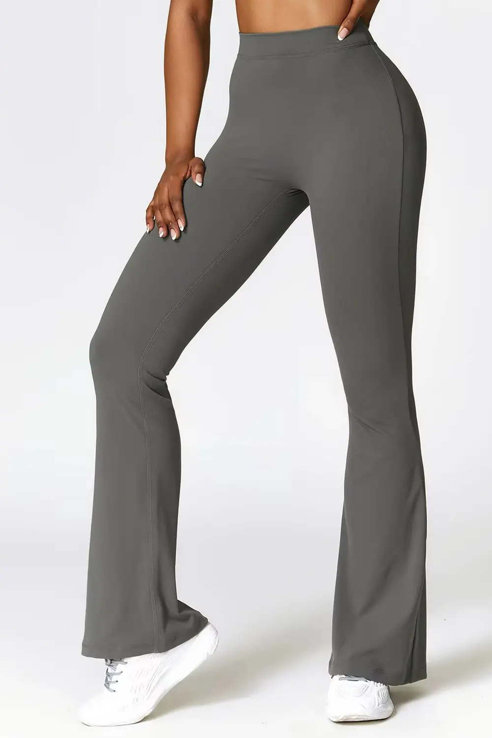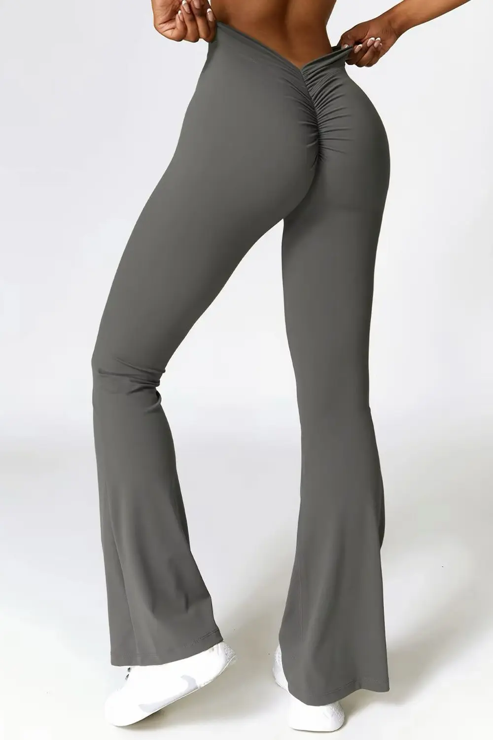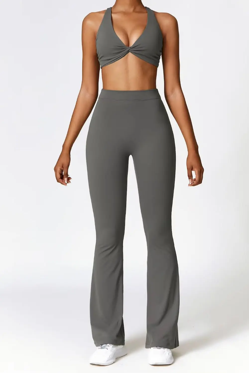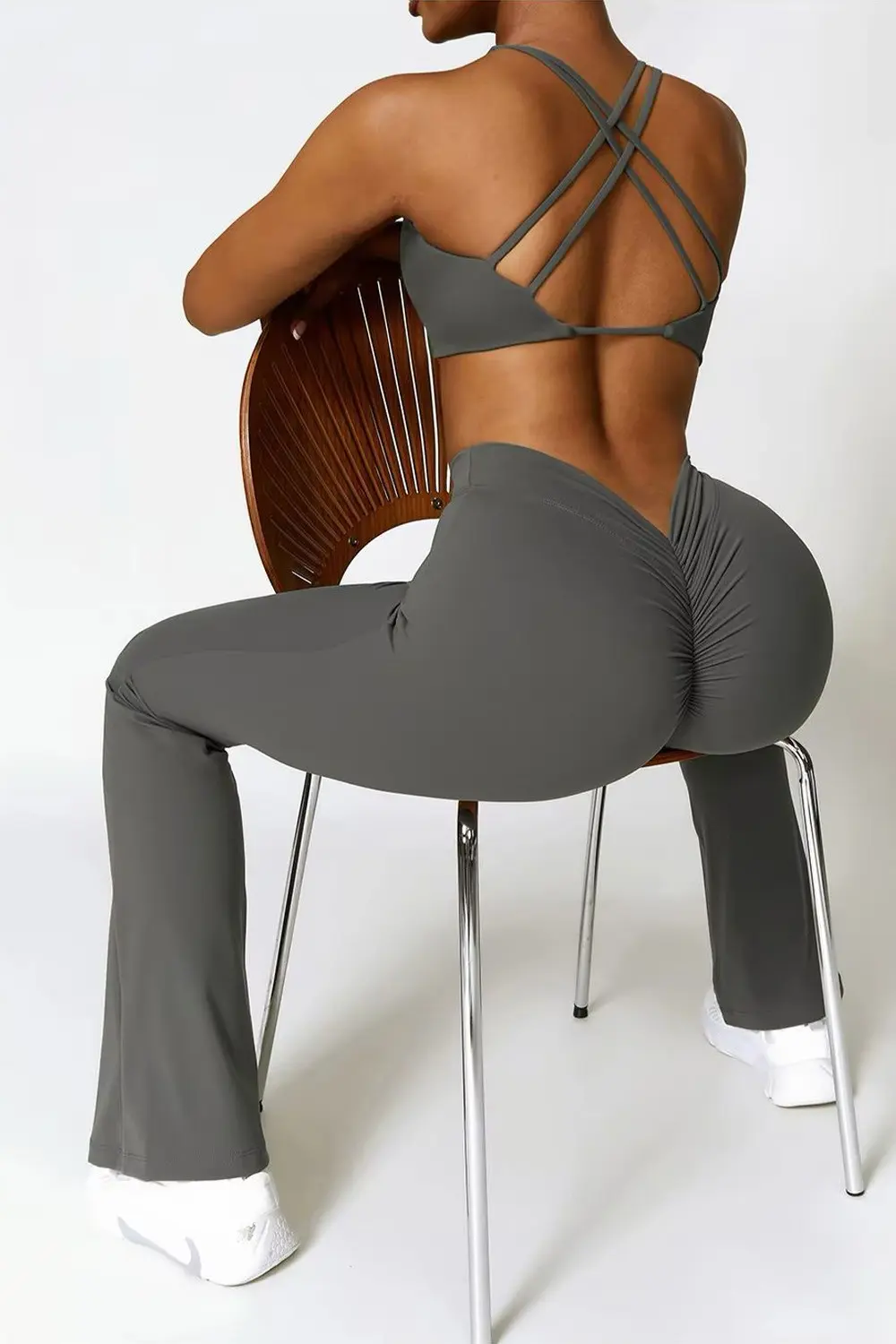 Conjunto esportivo com top de alças cruzadas e detalhe torcido no busto, combinando sustentação e estilo. A calça de cintura alta modela o corpo, com detalhe franzido nas costas e barra flare para um toque elegante. Perfeito para treinos e looks casuais!