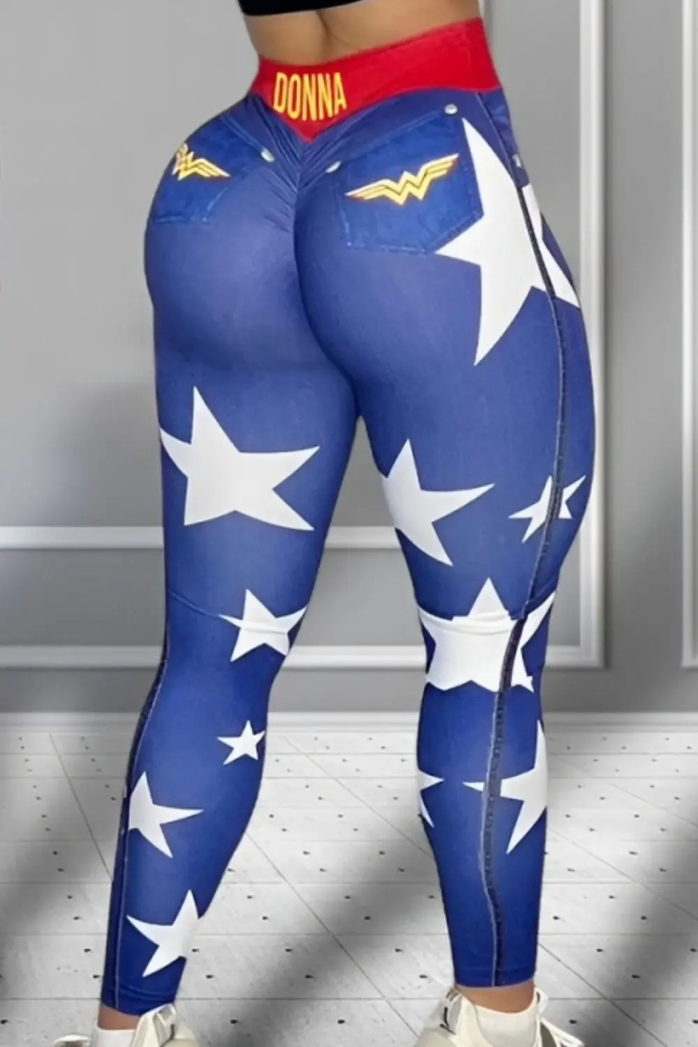 A legging é inspirada no uniforme da Mulher-Maravilha, com um design predominantemente azul adornado por estrelas brancas distribuídas uniformemente, remetendo ao estilo icônico do personagem. A cintura é alta e em vermelho vibrante, trazendo um toque de contraste, enquanto o ajuste justo valoriza as formas e reflete o estilo clássico de super-heroína. CONTÉM EMPINA BUMBUM, que realça as curva.