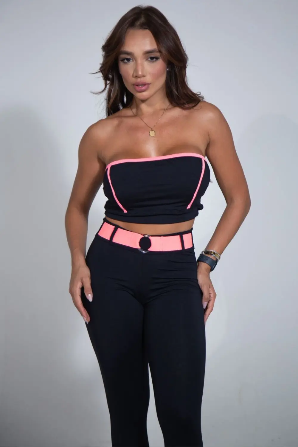Calça legging com modelagem ajustada e cós alto, oferecendo excelente sustentação e conforto. O grande destaque é o cinto embutido em tecido neon com detalhe de fivela frontal em argola metálica, que adiciona um toque moderno e ousado à peça. A parte traseira possui efeito “empina bumbum” com franzido central, valorizando a silhueta de forma natural. Confeccionada em material encorpado e elástico, ideal para treinos ou composições casuais com estilo.
