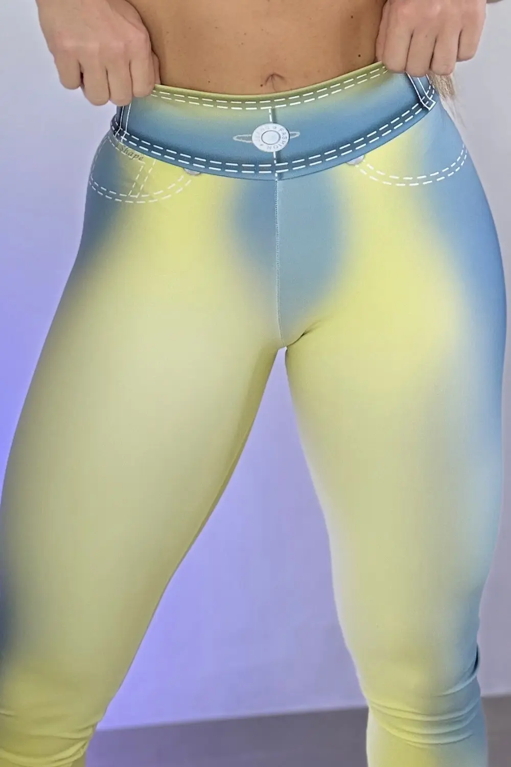 Essas leggings de cintura alta apresentam um design que simula calças jeans, com estampa de bolsos, botões e costuras. A peça tem um efeito degradê de azul para amarelo, proporcionando um visual moderno e vibrante. A modelagem de alta compressão garante suporte e conforto durante os exercícios.
