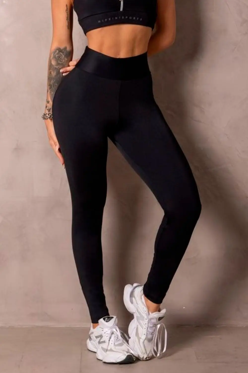 Legging preta com cós alto que modela a cintura e recorte empina bumbum que valoriza as curvas. Confeccionada em tecido firme e confortável, ideal para treinos ou composições casuais com estilo.