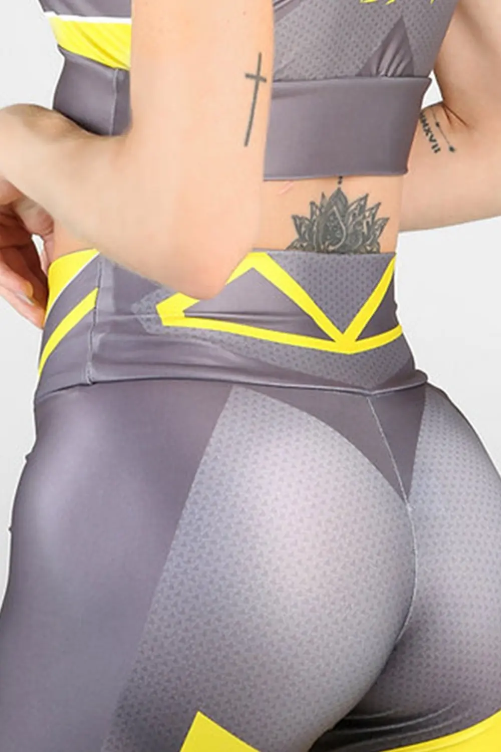 Características: Legging fitness amarela de cós alto com estampa gráfica cinza sobre a peça inteira. Tem Proteção FPS 50 de proteger sua pele dos efeitos nocivos dos raios UVa e UVb. Legging sem empina bumbum
