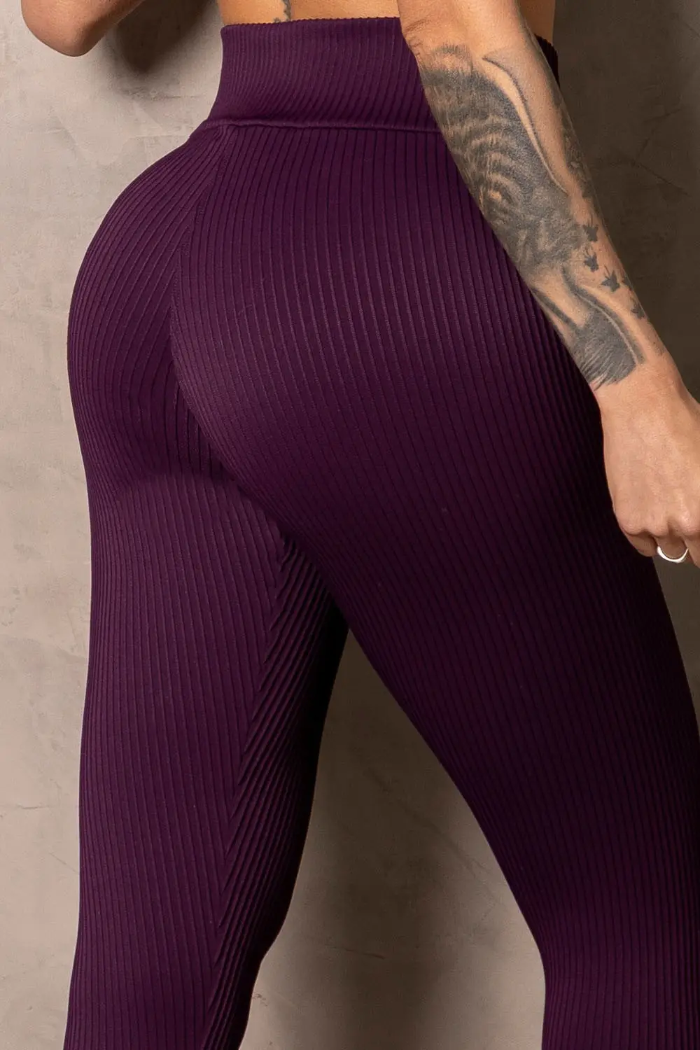 Legging roxa com tecido canelado de alta elasticidade, cós cruzado que valoriza a cintura e modelagem que realça as curvas com conforto e sustentação.