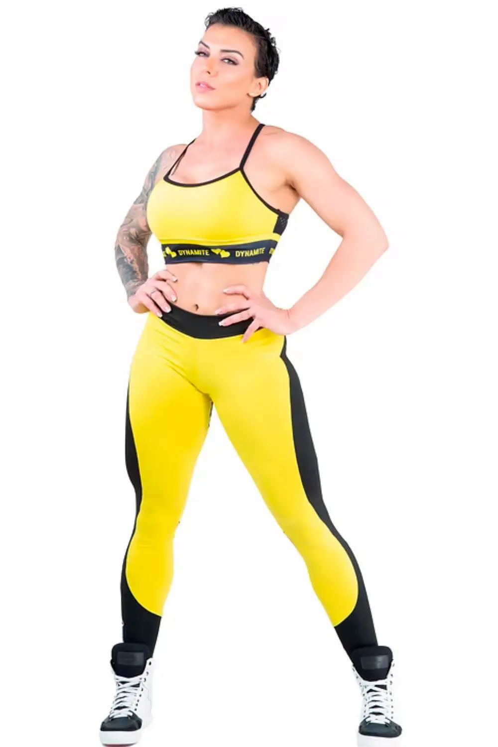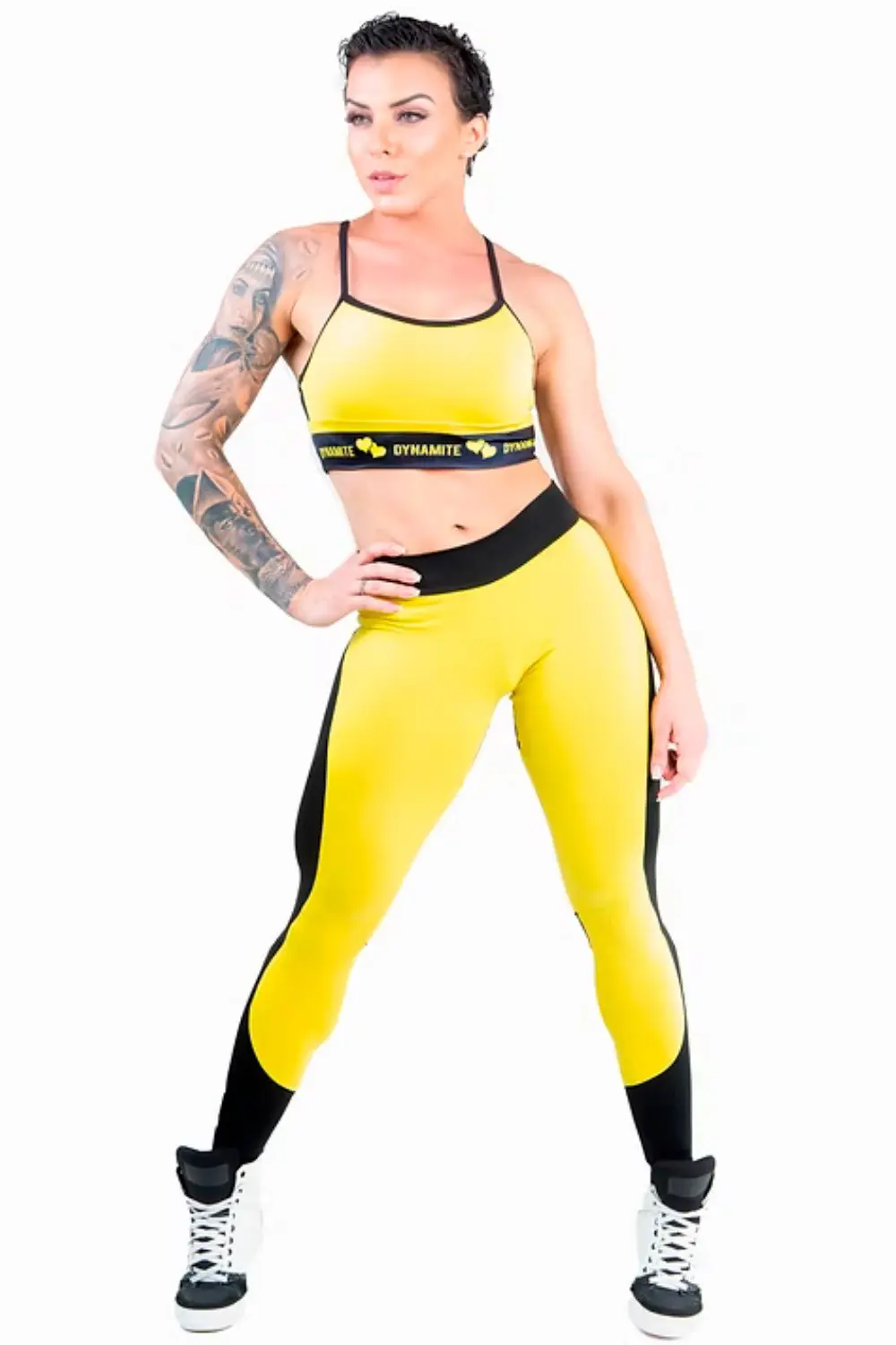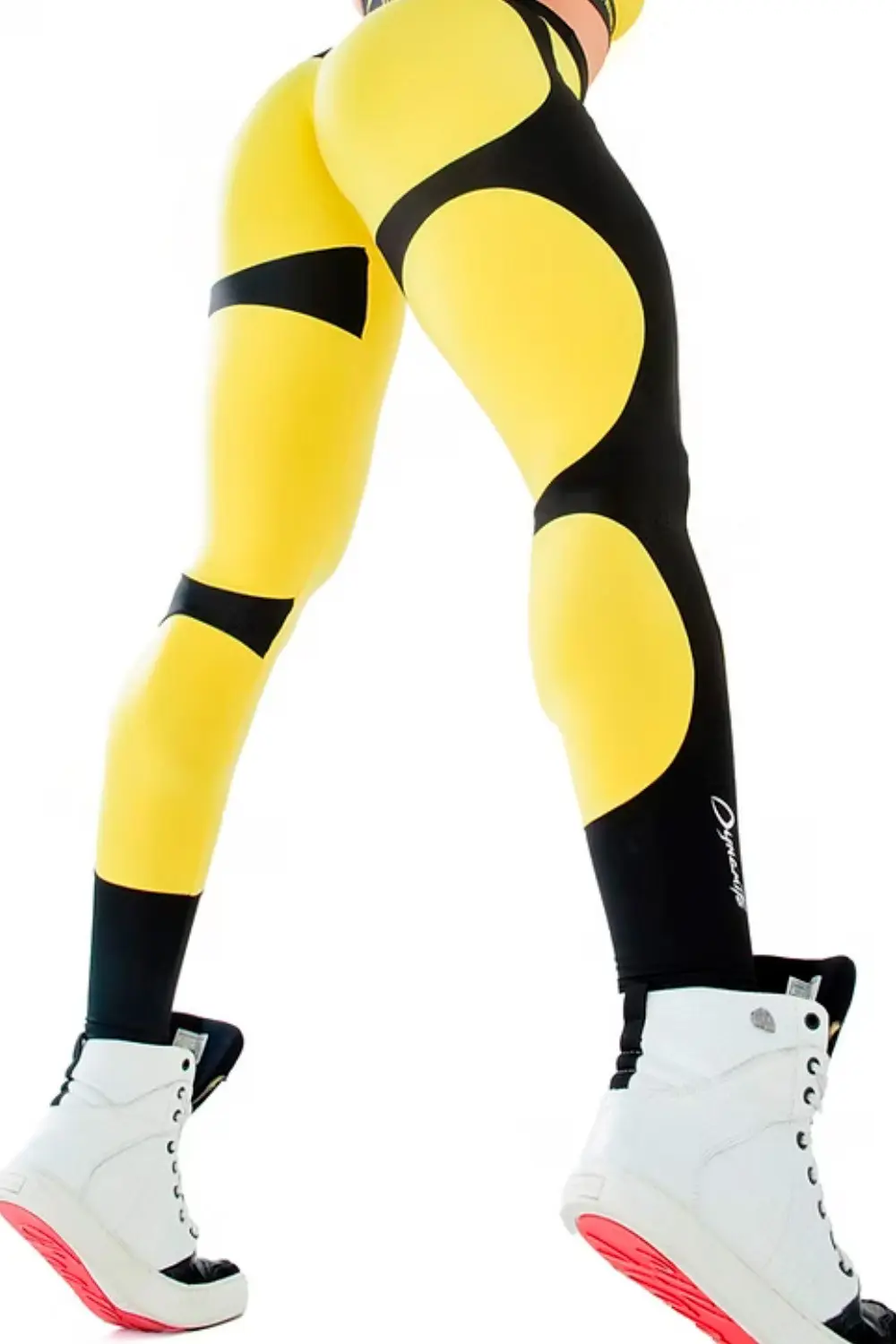 legging de cintura media apresenta um design arrojado com painéis em amarelo vibrante e preto. O tecido de alta compressão modela o corpo e oferece suporte muscular, ideal para treinos intensos. O cós largo garante um ajuste seguro e confortável. O corte moderno e a combinação de cores criam um visual dinâmico, perfeito para quem busca um look que se destaque na academia.