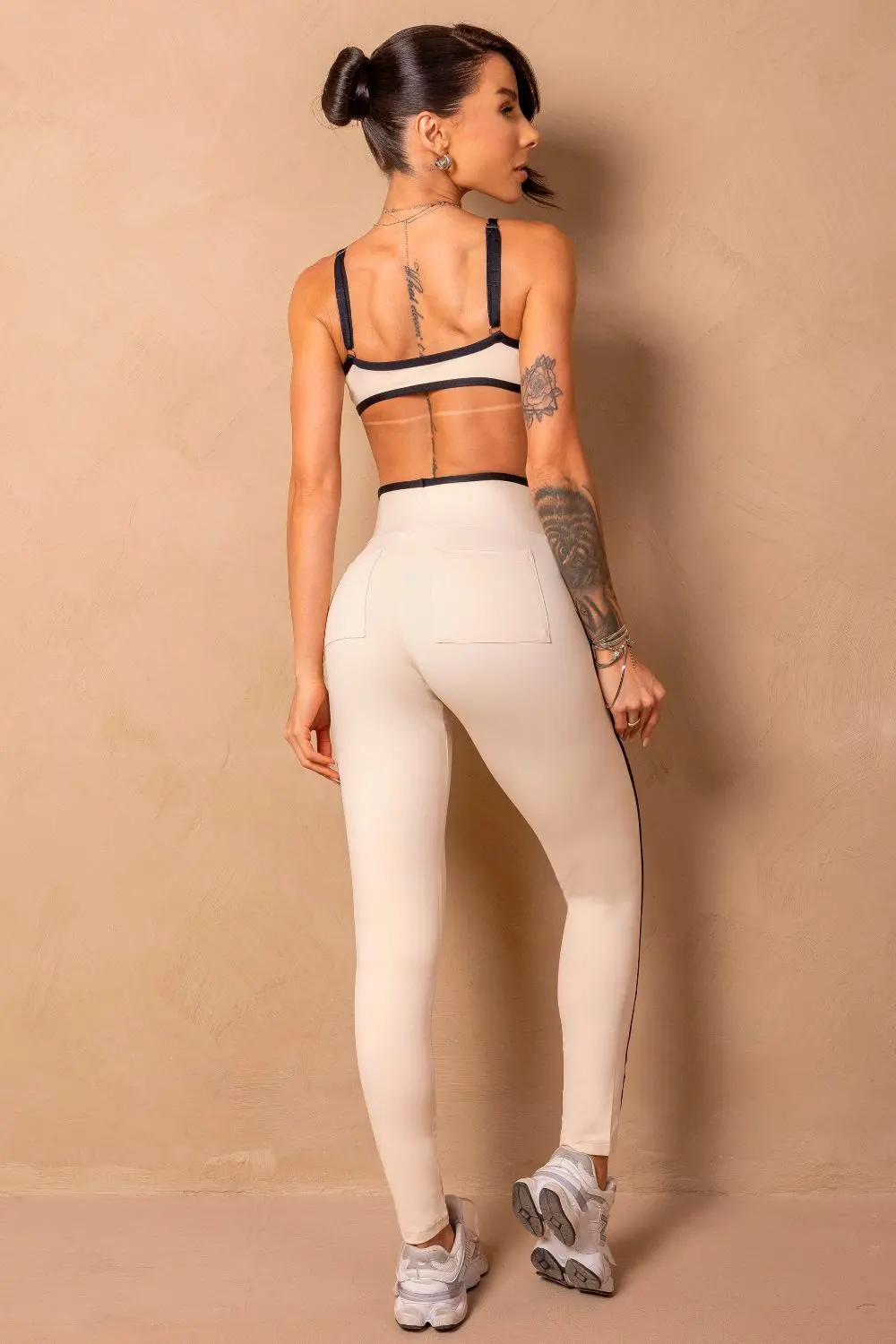 Legging creme com recortes laterais em preto que alongam a silhueta e realçam as curvas. Cós alto com logo centralizado que garante sustentação e conforto durante o treino ou no dia a dia.