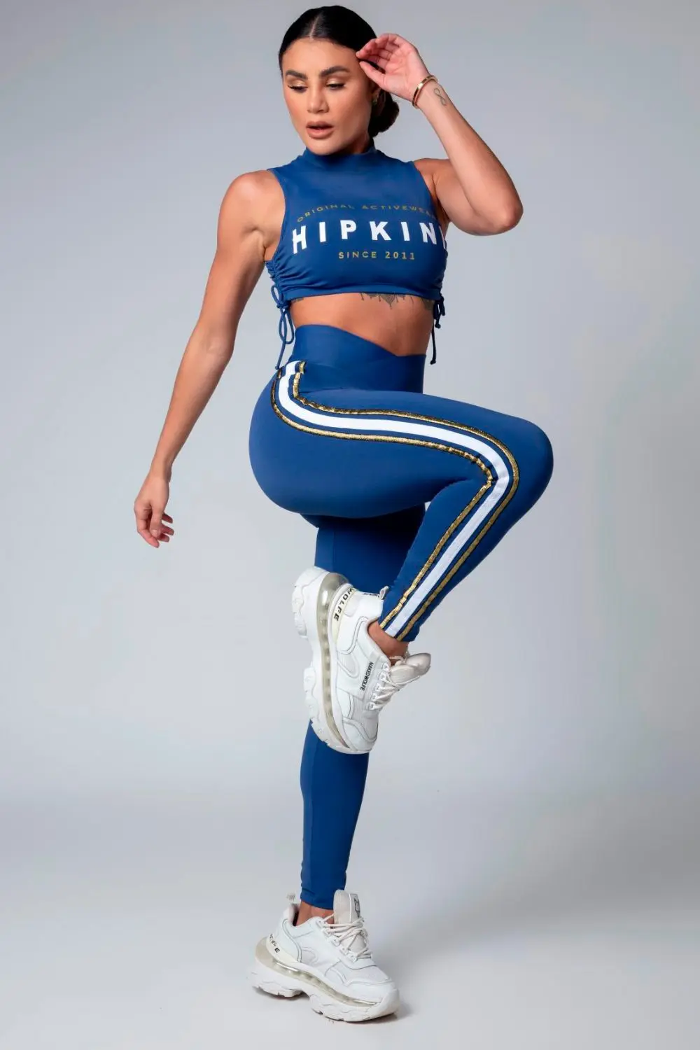 Legging azul com listras laterais em branco e dourado, cós alto e modelagem que valoriza as curvas. Confortável e estilosa, ideal para treinos e looks casuais.