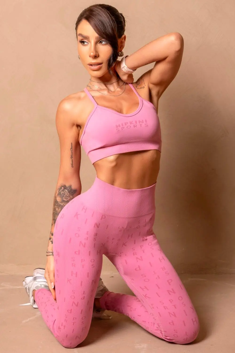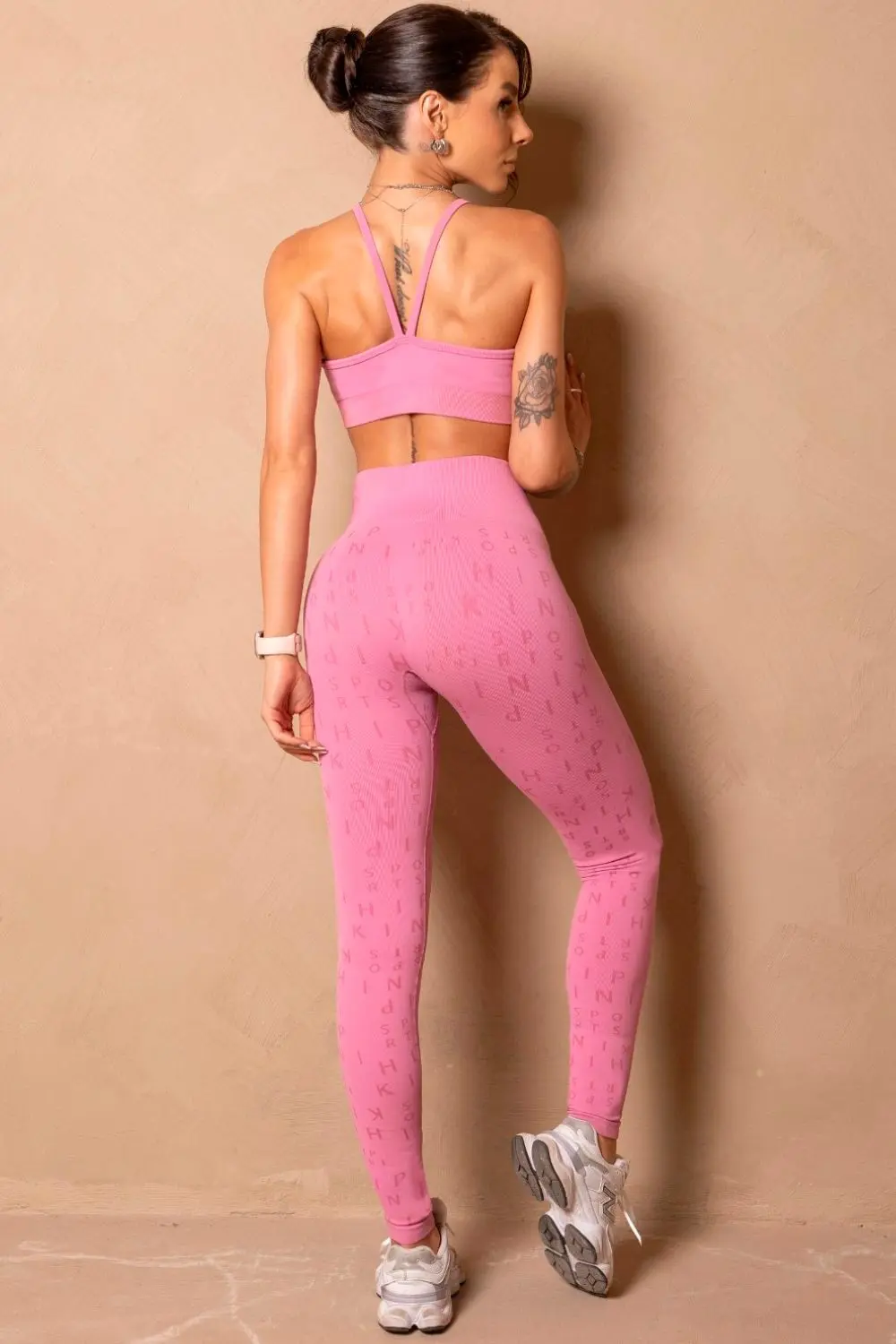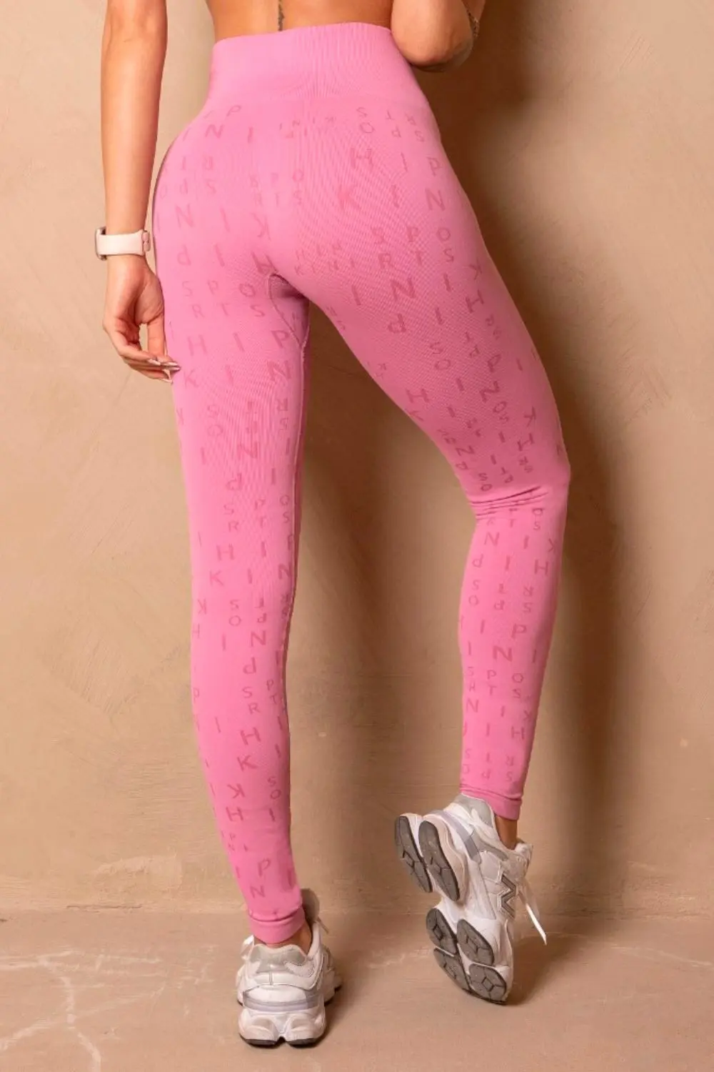 Legging em tom rosa com estampa discreta de letras, cós alto que modela a cintura e tecido de alta compressão. Ideal para treinos e composições casuais, une conforto e estilo minimalista.