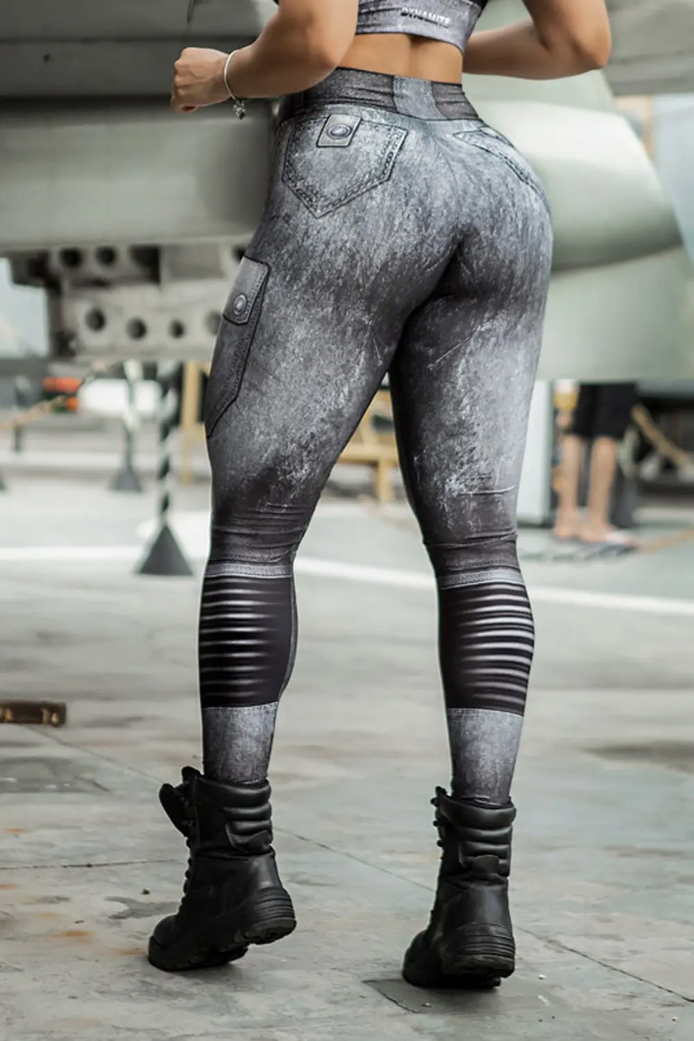 Características: Legging feita em tecido com estampa 3D com muscle shading e detalhes em metal, borracha e fake jeans. Possui elástico no cós.