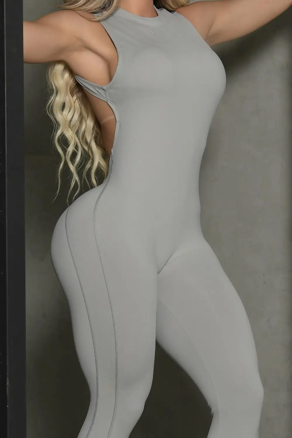 Macacão fitness cinza, com modelagem justa ao corpo, feito em tecido elástico de alta compressão. Possui costas totalmente abertas, com recorte cavado que valoriza a silhueta. A parte traseira tem costura estratégica no centro do glúteo, promovendo efeito “empina bumbum”. As pernas são longas, até o tornozelo, e a gola é alta, estilo halter neck, sem mangas. O design é moderno, sensual e ideal para treinos ou uso casual com estilo.