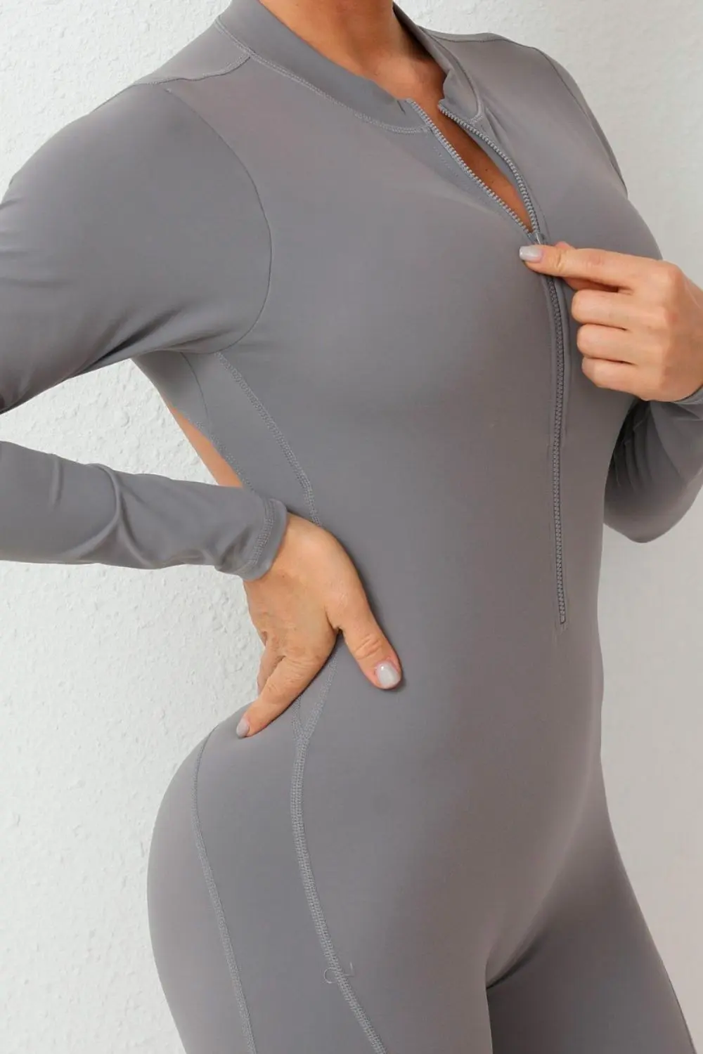 Características: Macacão fitness manga longa, com decote longo sobreposto com ziper que vai da sua gola ao meio do abdome.