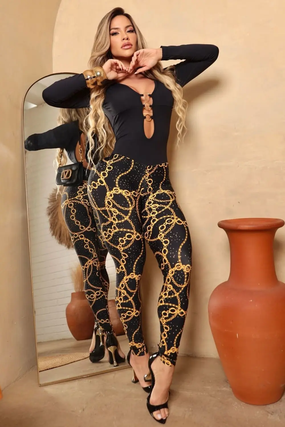 Macacão sofisticado com estampa de correntes douradas sobre fundo preto, modelagem justa que valoriza as curvas e decote frontal com detalhe em argolas. Costas abertas para um toque de ousadia e elegância.