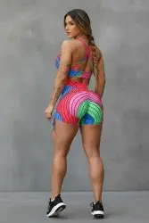O macaquinho é colorido e vibrante, com padrões de linhas onduladas em cores como rosa, verde e azul. Possui decote em V, alças largas e detalhes ajustáveis nas coxas com laços, ideal para atividades físicas.