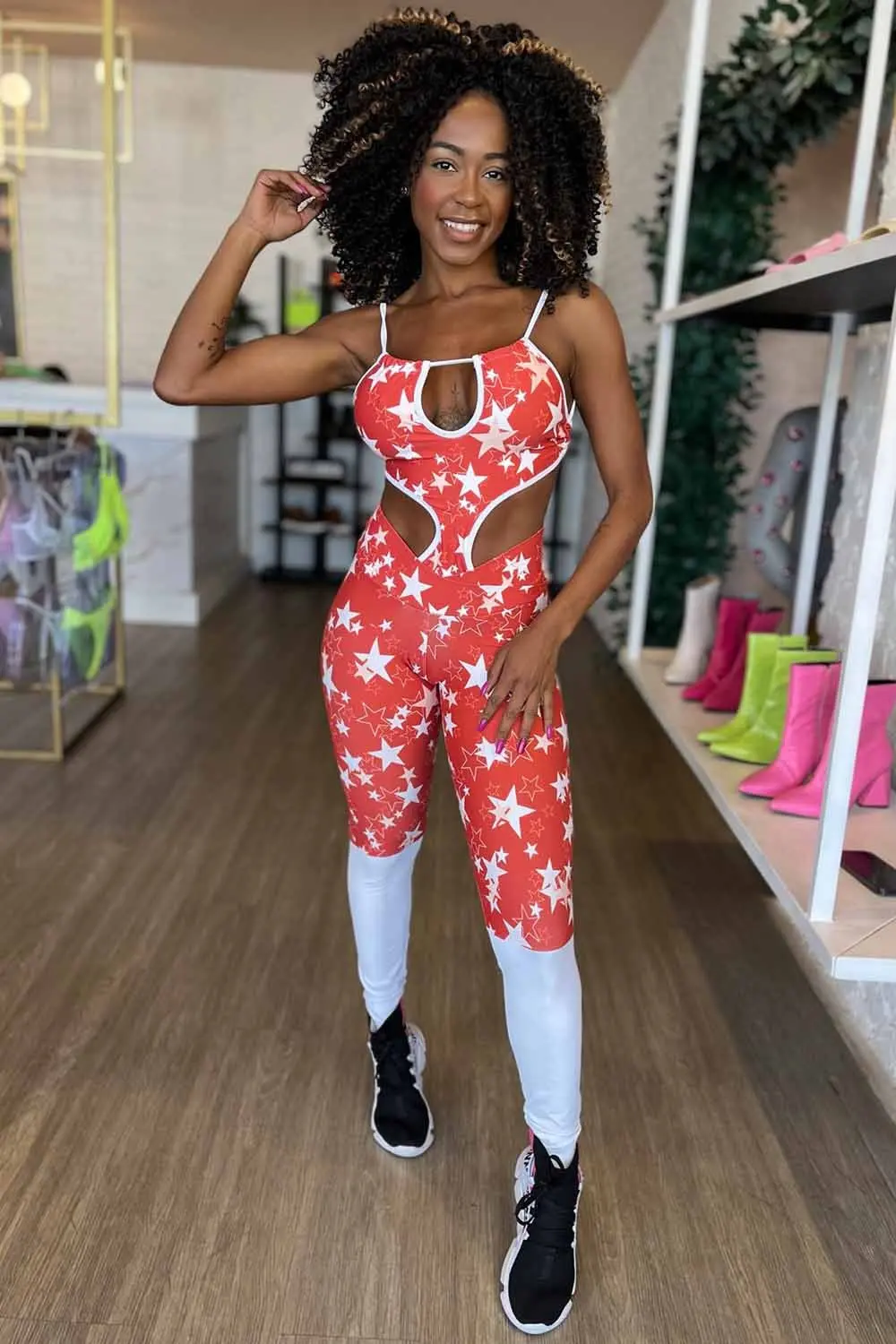 Liberte sua estrela interior com nosso macacão fitness vermelho! Esta atraente peça única apresenta uma estampa divertida de estrelas brancas que farão você se sentir como se estivesse dançando entre o cosmos. O decote chique adiciona um toque de elegância, enquanto as aberturas decorativas nos quadris trazem um toque de ousadia e estilo à sua rotina de exercícios. E não vamos esquecer as costas abertas, permitindo que você exiba sua confiança e mantenha a calma durante os treinos intensos.