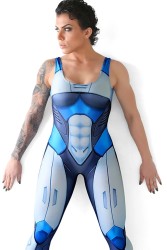 Características: Macacão fitness azulo, modelo frente única, com alças grossas vermelhas e detalhamentos em sombreados. Ótima elasticidade e secagem rápida.