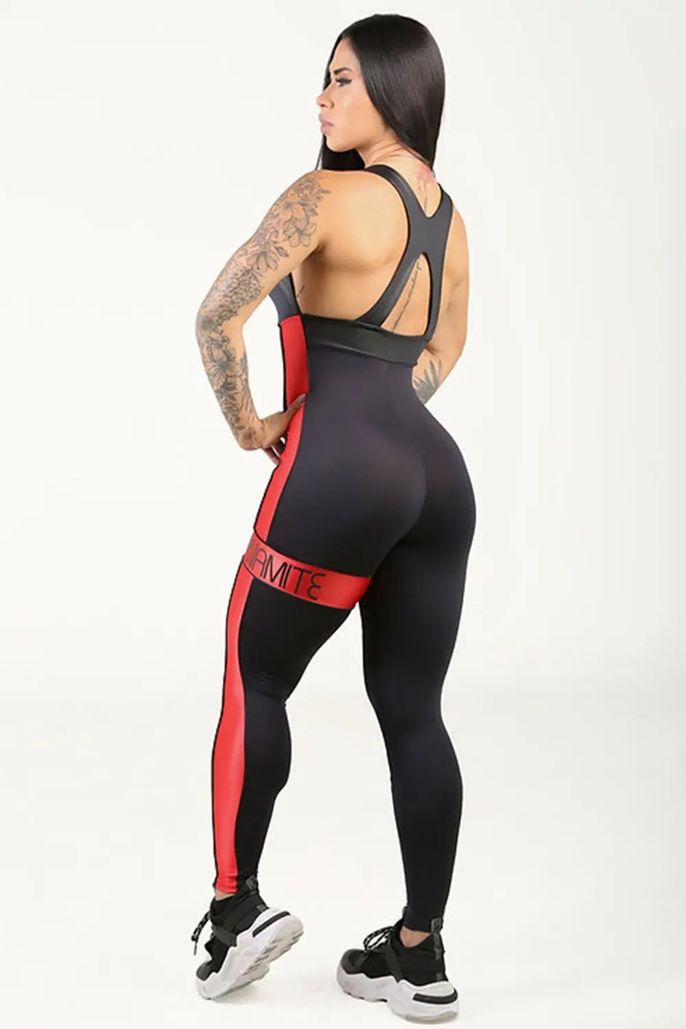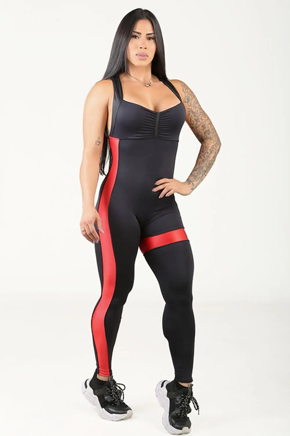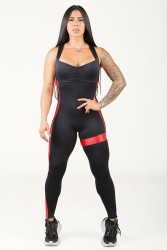 Características: Macacão fitness preto com detalhes em vermelho, super confortável para se usar no dia a dia e fazer seus treinos com mais estilo!